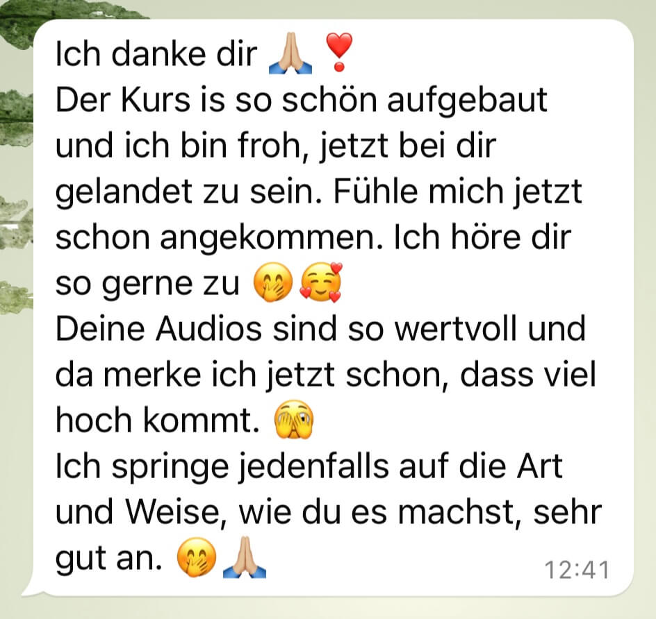 Austausch & Begleitung: Über eine geschützte WhatsApp-Gruppe (Du musst nicht aktiv schreiben. Du darfst mitlesen, fühlen und umsetzen)