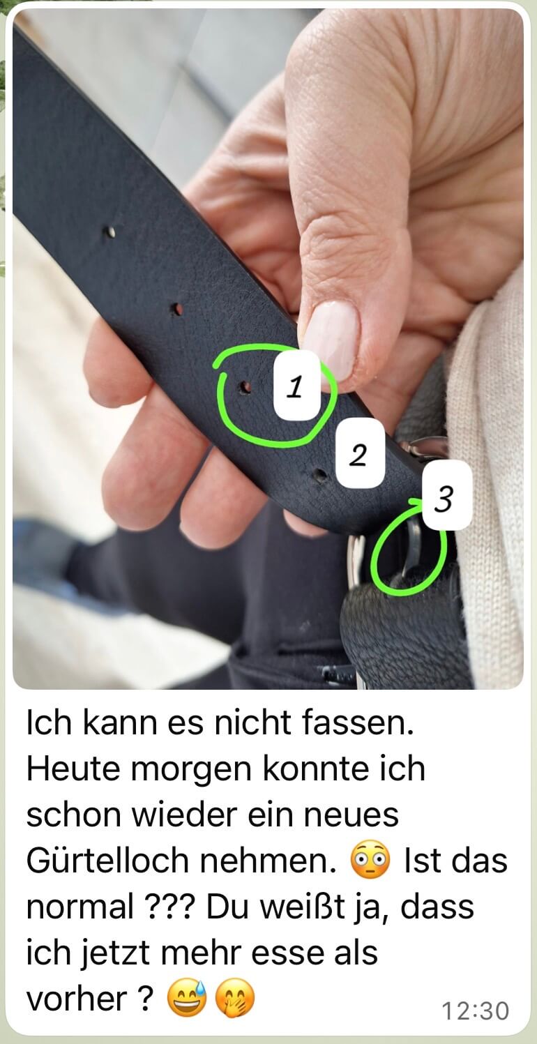 Du lernst, dich jetzt schon als schlanke Person zu fühlen und zu verhalten. Nicht erst, wenn die Waage eine bestimmte Zahl zeigt.